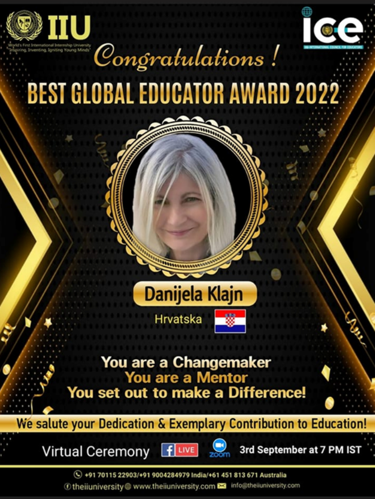 U konkurenciji među 5000 nominiranih svjetskih učitelja, nastavnika i profesora International Internship University dodjelio je nagradu i trima učiteljicama iz RH, a među njima je učiteljica iz OŠ Rugvica, Danijela Klajn.